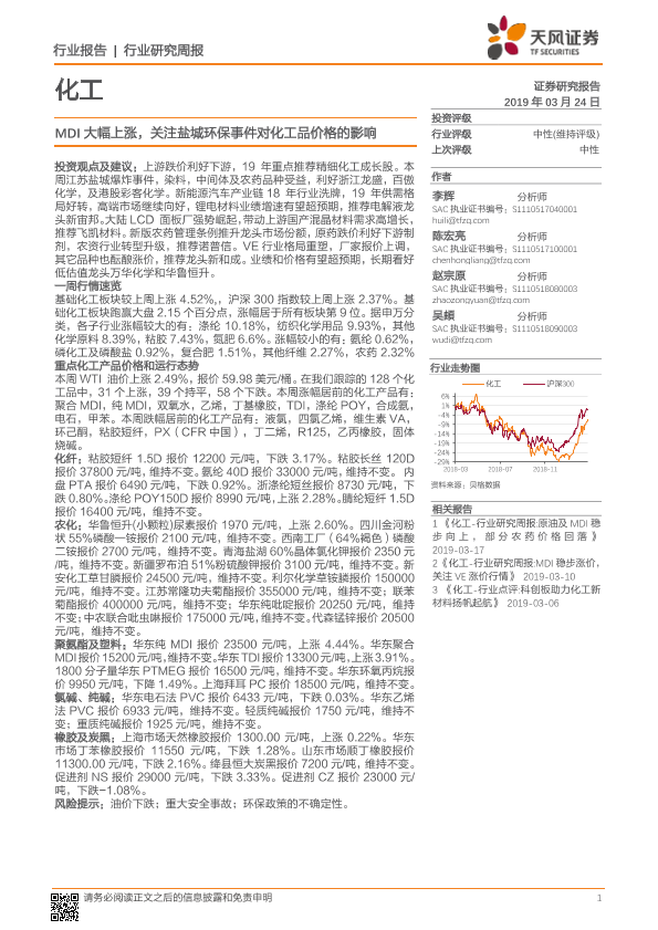 【天风证券】【20190324】20190324-天风证券-化工行业研究周报:MDI大幅上涨,关注盐城环保事件对化工品价格的影响-17页