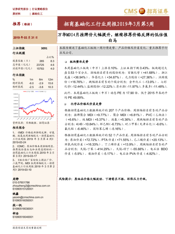 【海通证券】【20190331】招商基础化工行业周报2019年3月第5周:万华MDI4月挂牌价大幅提升,继续推荐价格反弹的低估值白马-21页