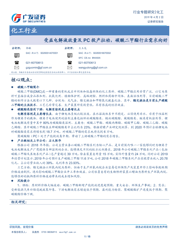 【广发证券】【20190402】受益电解液放量及PC投产拉动,碳酸二甲酯行业需求向好-15页