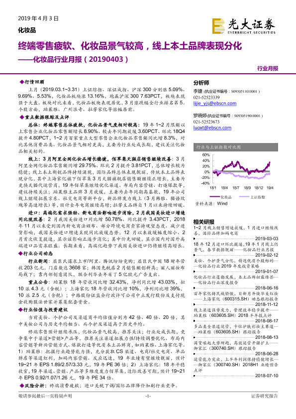 【光大证券】【20190403】化妆品行业月报:终端零售疲软、化妆品景气较高,线上本土品牌表现分化-18页