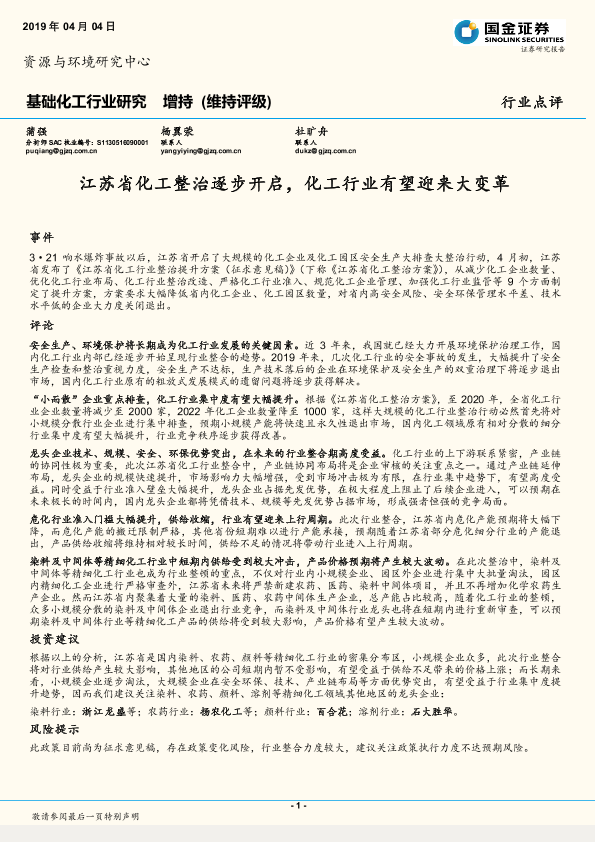 【国金证券】【20190404】基础化工行业研究:江苏省化工整治逐步开启,化工行业有望迎来大变革-5页
