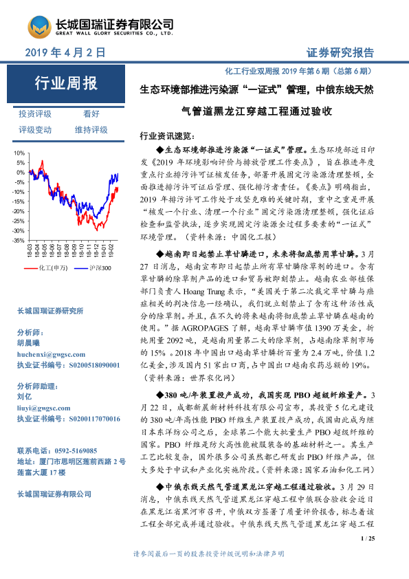 【长城国瑞证券】【20190402】化工行业双周报2019年第6期(总第6期):生态环境部推进污染源“一证式”管理,中俄东线天然气管道黑龙江穿越工程通过验收-25页