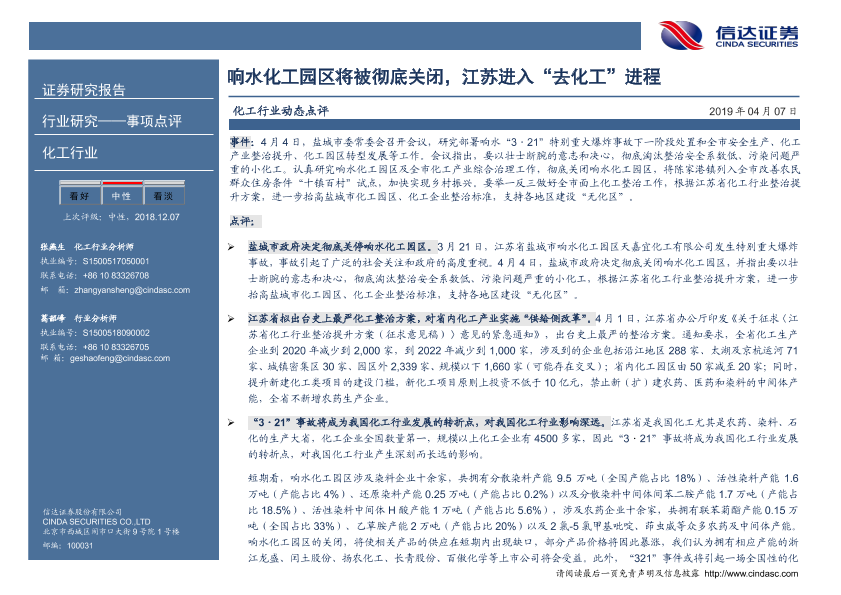 【信达证券】【20190407】化工行业动态点评:响水化工园区将被彻底关闭,江苏进入“去化工”进程-4页