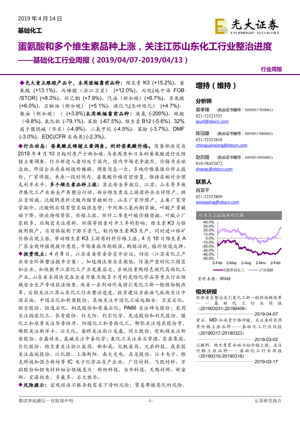 【光大证券】【20190414】基础化工行业周报:蛋氨酸和多个维生素品种上涨,关注江苏山东化工行业整治进度-19页