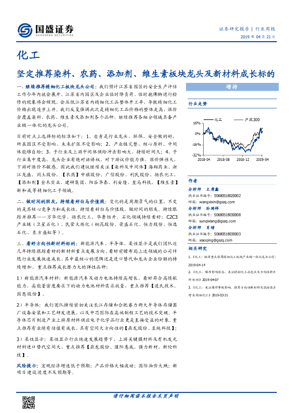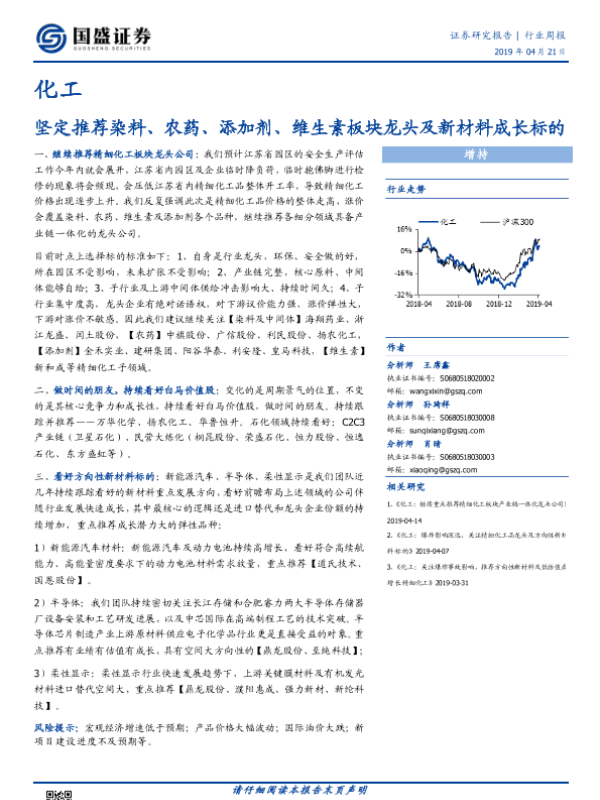 【国盛证券】【20190421】20190421-国盛证券-化工行业周报:坚定推荐染料、农药、添加剂、维生素板块龙头及新材料成长标的-8页