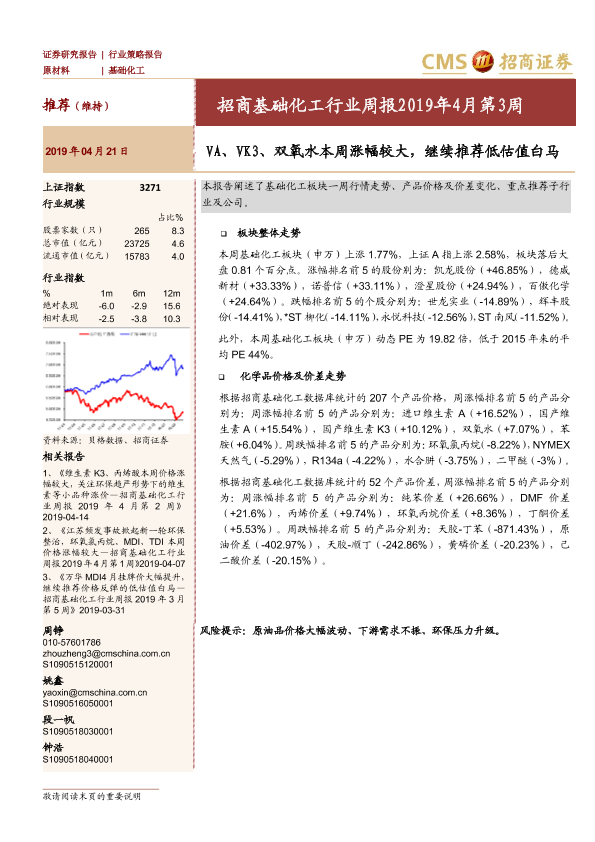 【海通证券】【20190421】招商基础化工行业周报2019年4月第3周:VA、VK3、双氧水本周涨幅较大,继续推荐低估值白马-24页