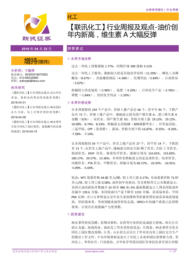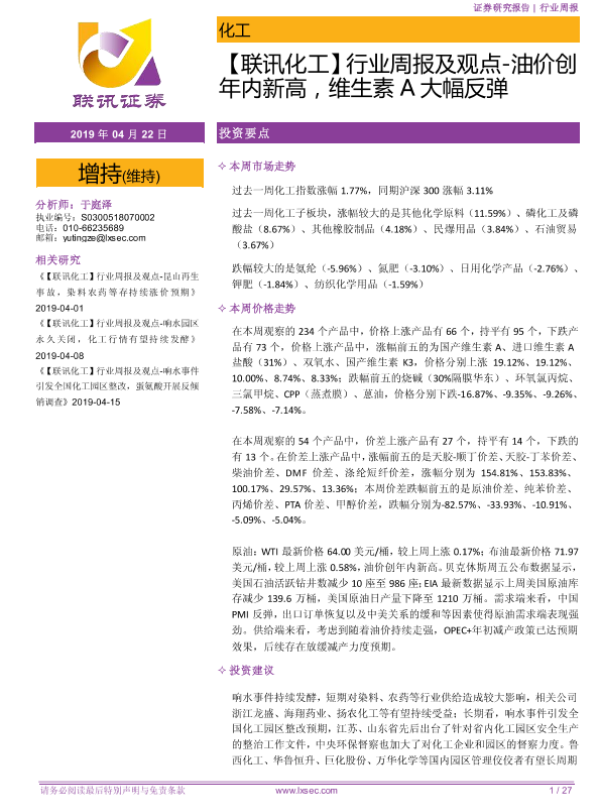 【粤开证券】【20190422】行业周报及观点-油价创年内新高,维生素A大幅反弹-27页