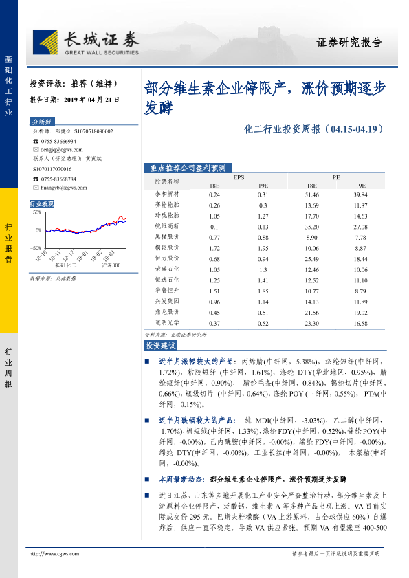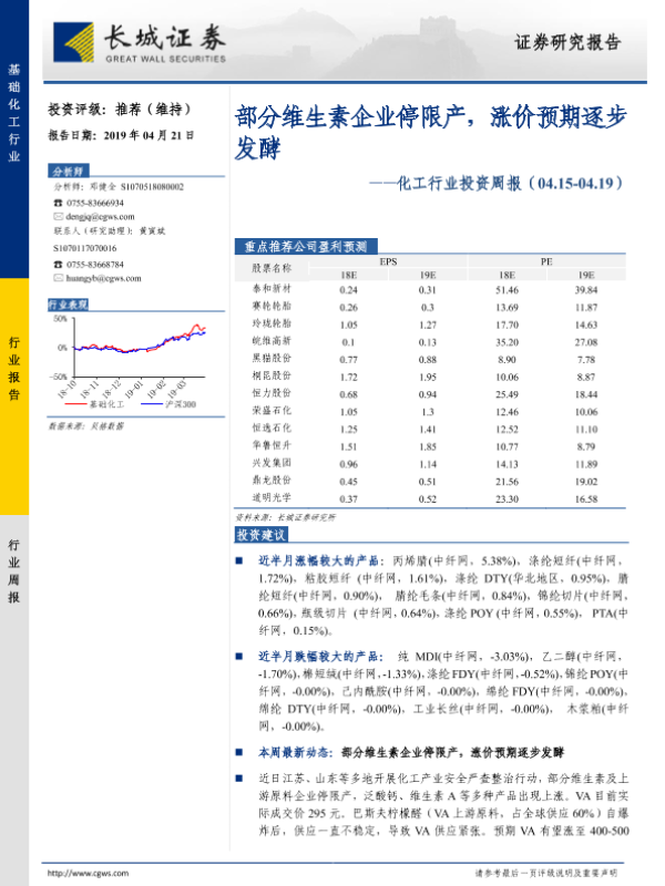 【长城证券】【20190421】20190421-长城证券-化工行业投资周报:部分维生素企业停限产,涨价预期逐步发酵-35页