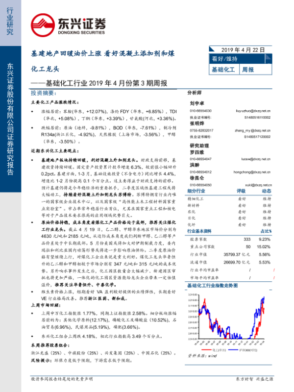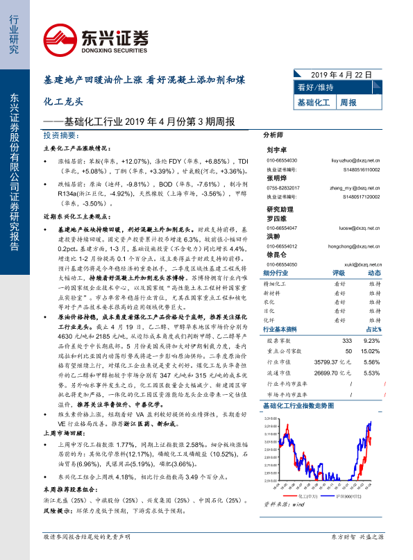【东兴证券】【20190422】基础化工行业2019年4月份第3期周报:基建地产回暖油价上涨 看好混凝土添加剂和煤化工龙头-38页