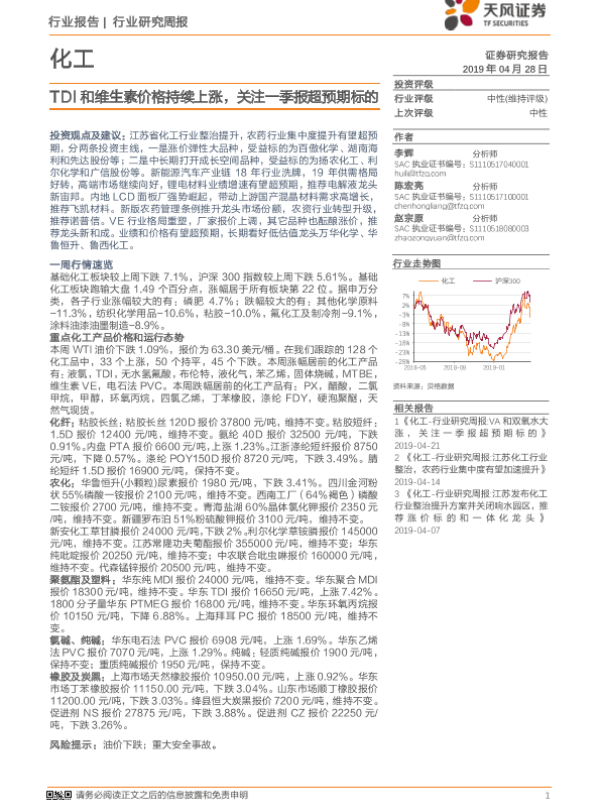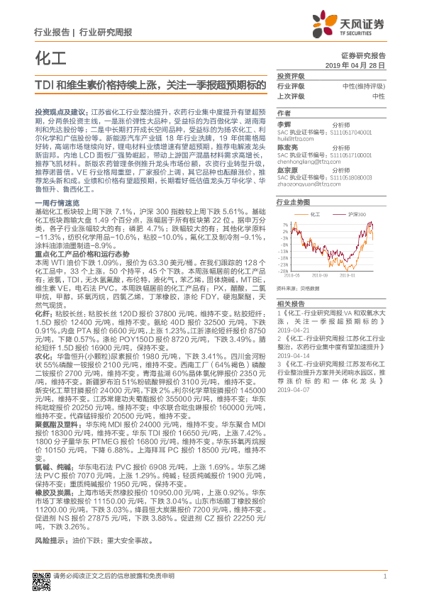 【天风证券】【20190428】20190428-天风证券-化工行业研究周报:TDI和维生素价格持续上涨,关注一季报超预期标的-17页