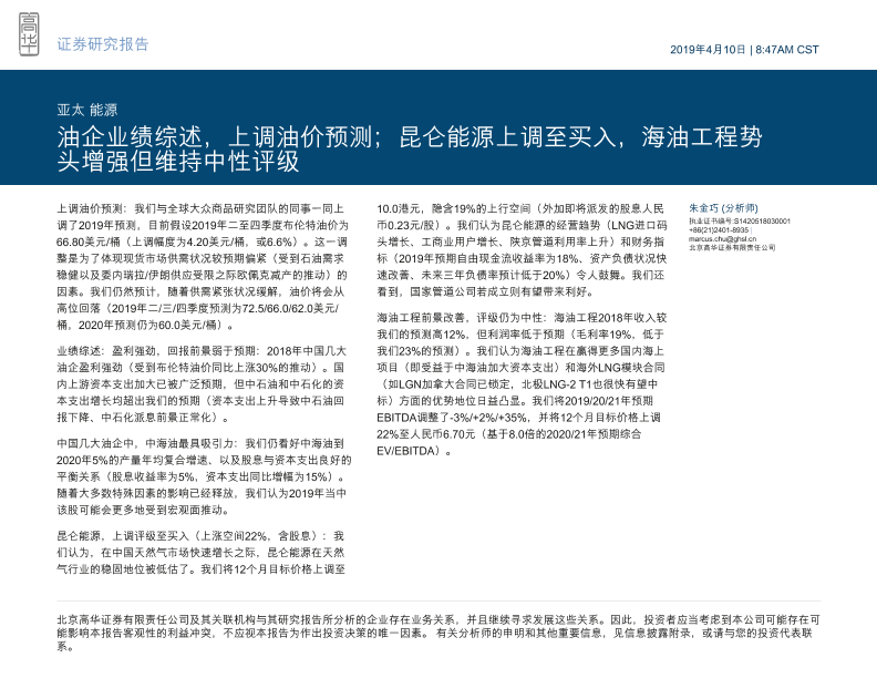 【Goldman Sachs】【20190410】能源:油企业绩综述,上调油价预测;昆仑能源上调至买入,海油工程势头增强但维持中性评级-11页