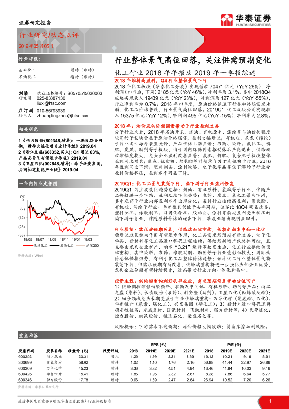 【华泰证券】【20190505】化工行业2018年年报及2019年一季报综述:行业整体景气高位回落,关注供需预期变化-13页