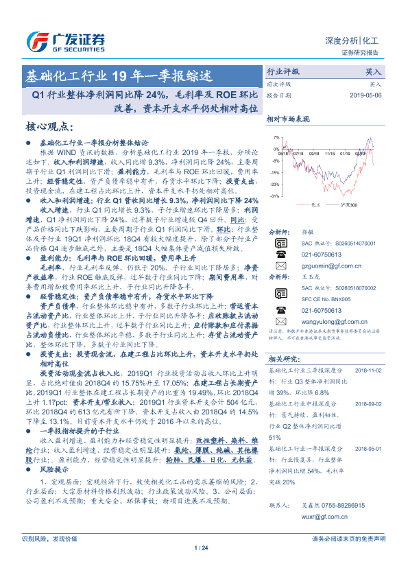 【广发证券】【20190506】基础化工行业19年一季报综述:Q1行业整体净利润同比降24%,毛利率及ROE环比改善,资本开支水平仍处相对高位-24页