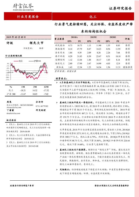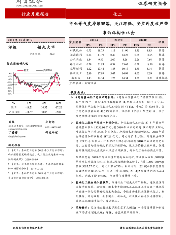 【财信证券】【20190509】20190509-财信证券-化工行业月度报告:行业景气度持续回落,关注环保、安监再度收严带来的结构性机会-9页