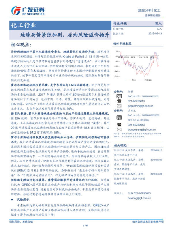 【广发证券】【20190513】化工行业跟踪分析:地缘局势紧张加剧,原油风险溢价抬升-6页