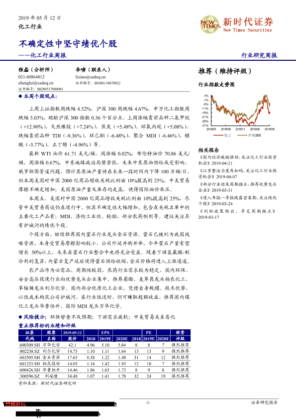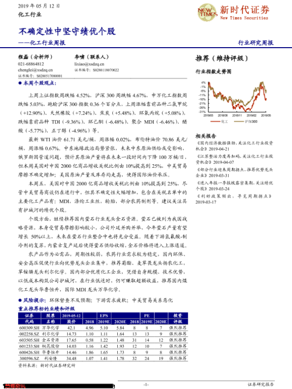【新时代证券】【20190512】20190512-新时代证券-化工行业周报:不确定性中坚守绩优个股-27页