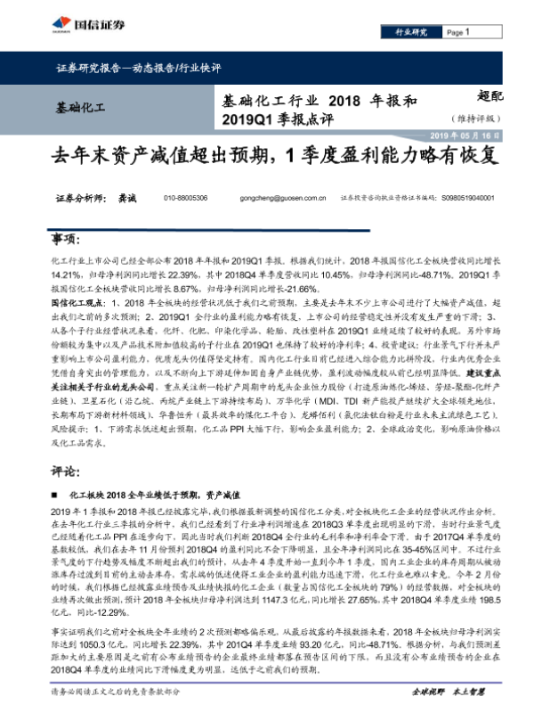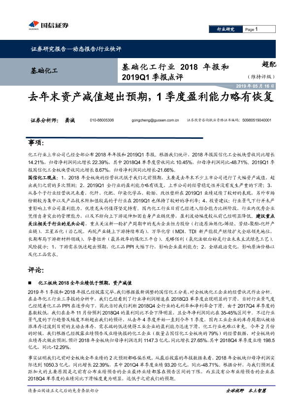 【国信证券】【20190516】基础化工行业2018年报和2019Q1季报点评:去年末资产减值超出预期,1季度盈利能力略有恢复-10页