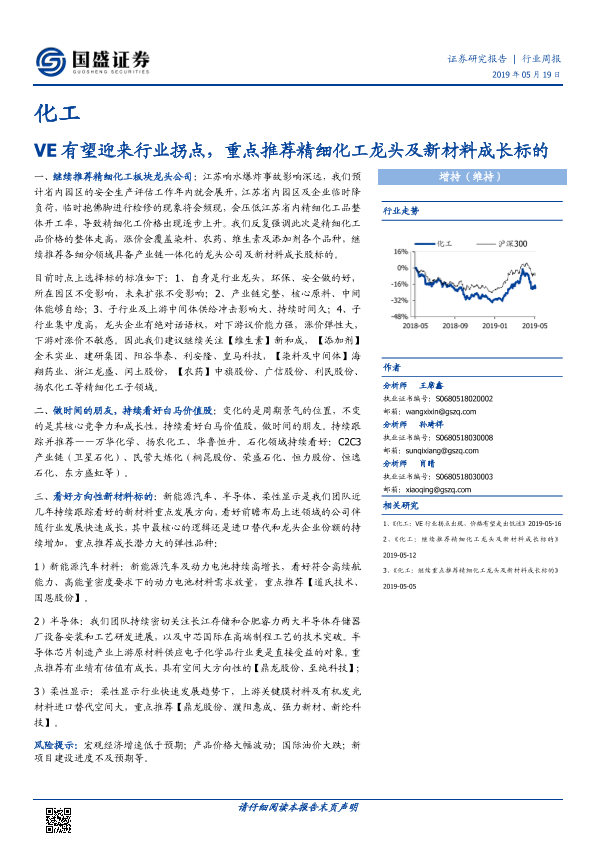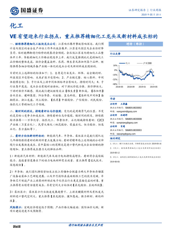 【国盛证券】【20190519】20190519-国盛证券-化工行业周报:VE有望迎来行业拐点,重点推荐精细化工龙头及新材料成长标的-6页