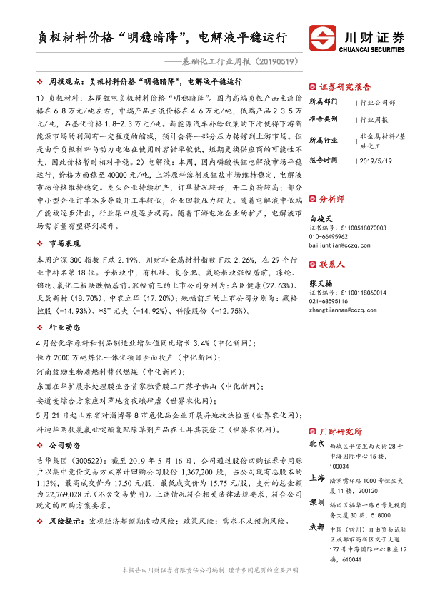 【川财证券】【20190519】20190519-川财证券-基础化工行业周报:负极材料价格“明稳暗降”,电解液平稳运行-21页
