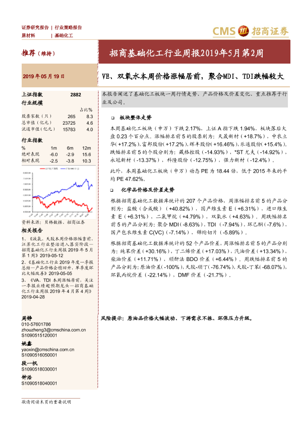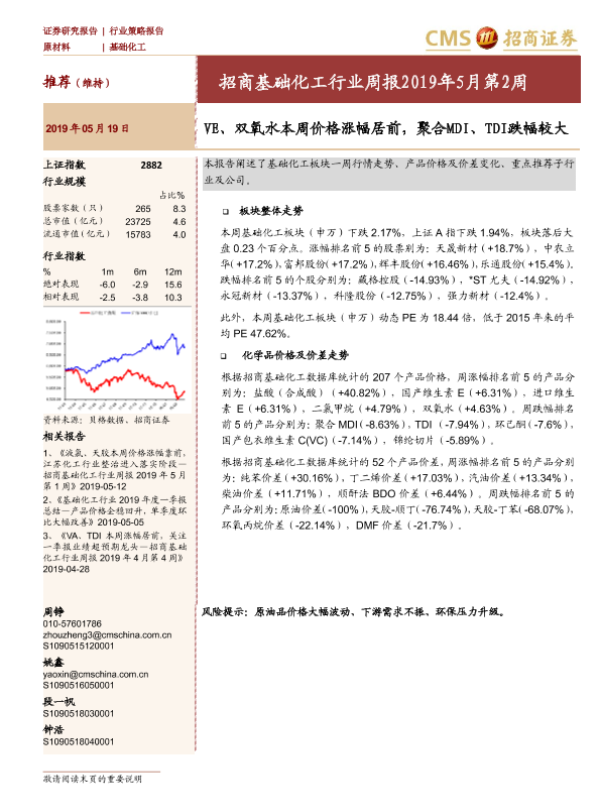 【海通证券】【20190519】招商基础化工行业周报2019年5月第2周:VE、双氧水本周价格涨幅居前,聚合MDI、TDI跌幅较大-17页