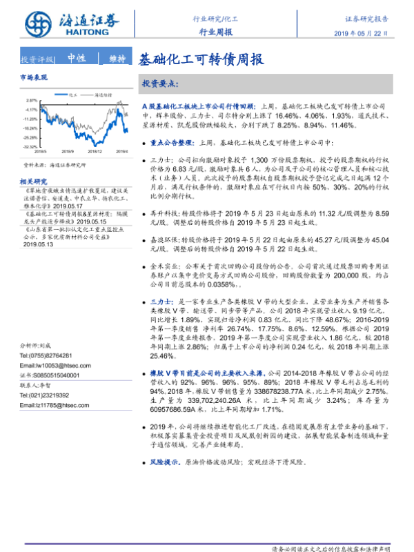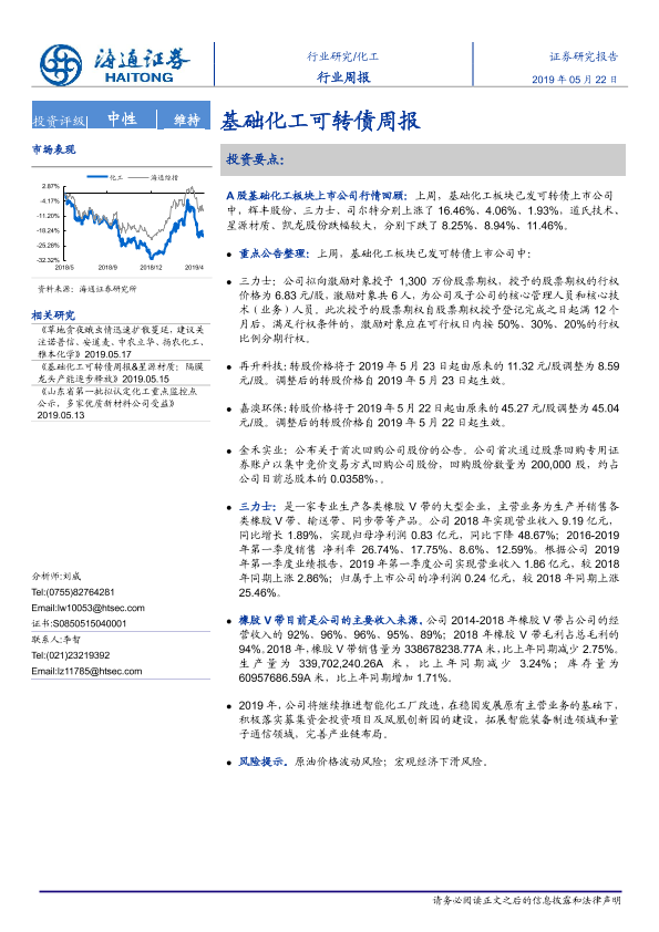 【海通证券】【20190522】20190522-海通证券-化工行业周报:基础化工可转债周报-12页