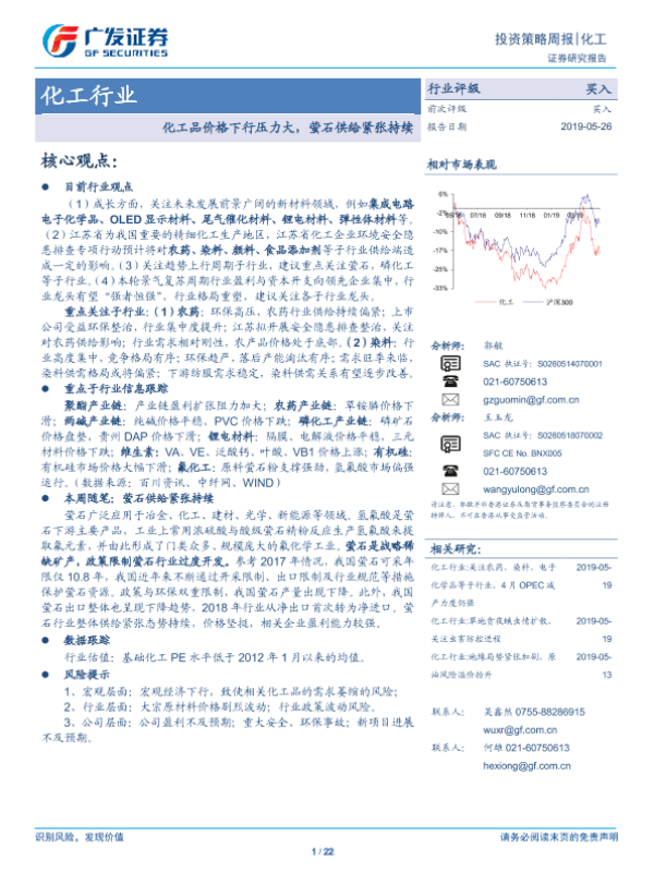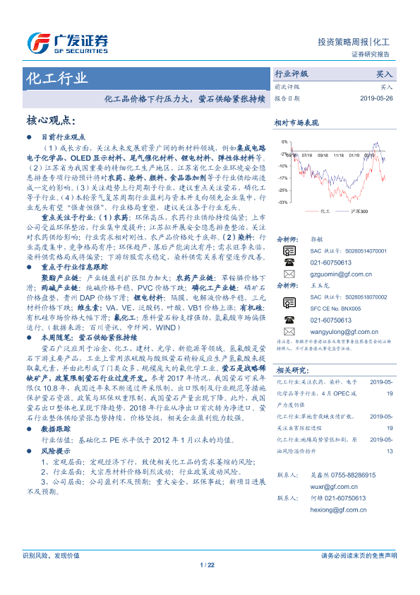 【广发证券】【20190526】20190526-广发证券-化工行业投资策略周报:化工品价格下行压力大,萤石供给紧张持续-22页