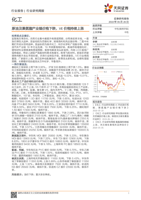 【天风证券】【20190526】20190526-天风证券-化工行业研究周报:原油及聚氨酯产业链价格下跌,VE价格持续上涨-17页