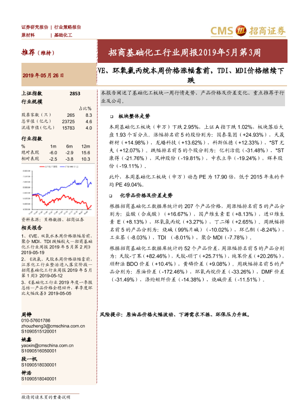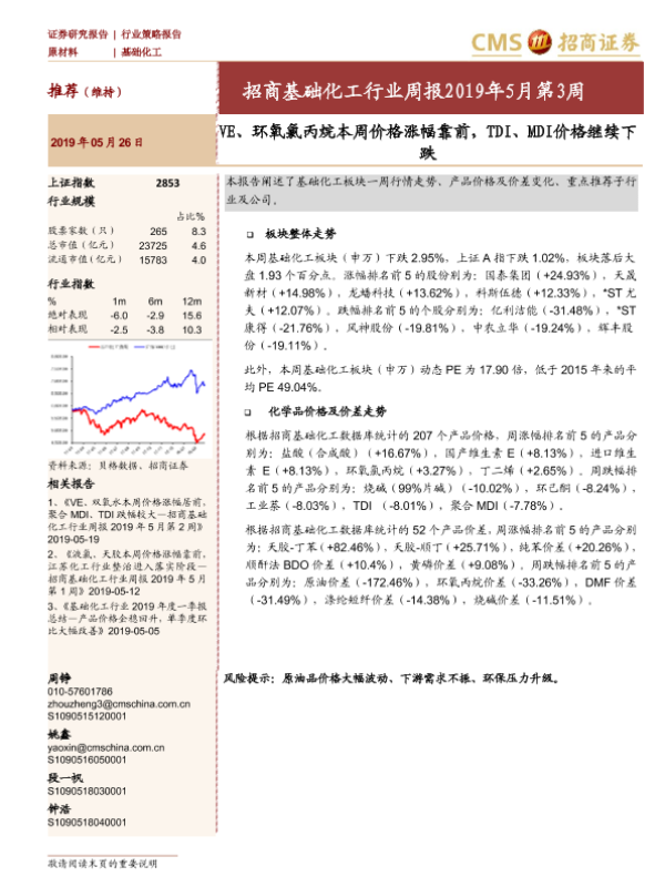 【海通证券】【20190526】招商基础化工行业周报2019年5月第3周:VE、环氧氯丙烷本周价格涨幅靠前,TDI、MDI价格继续下跌-18页