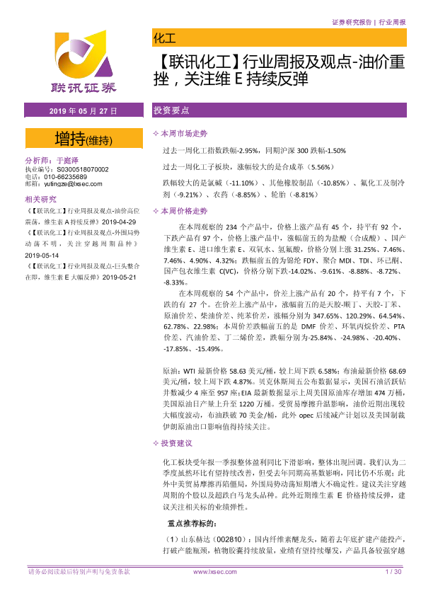 【粤开证券】【20190527】行业周报及观点-油价重挫,关注维E持续反弹-30页