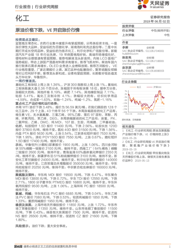 【天风证券】【20190602】20190602-天风证券-化工行业研究周报:原油价格下跌,VE开启涨价行情-18页
