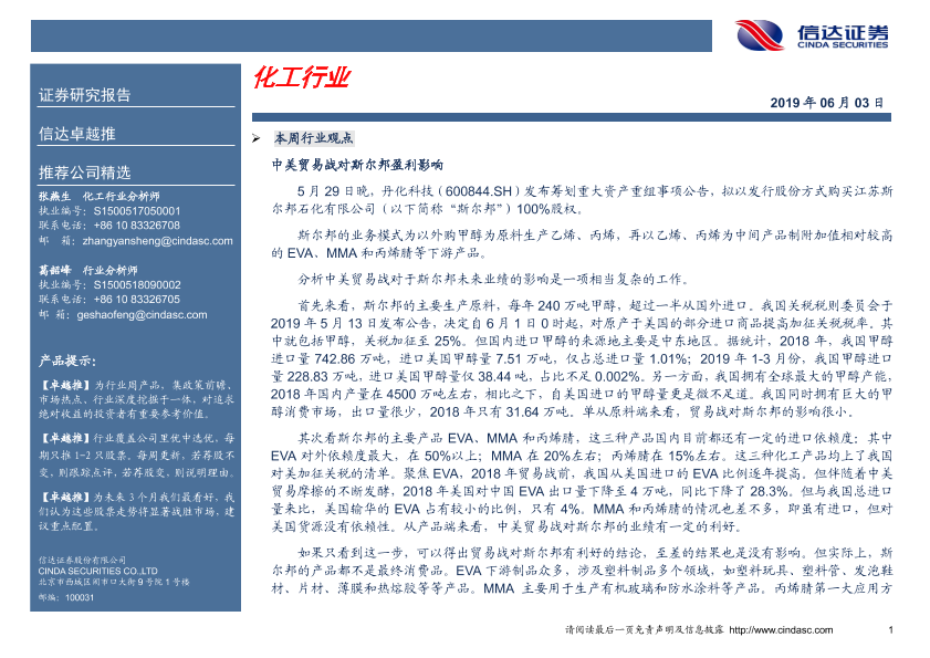 EVA 中美贸易战 化工行业 斯尔邦 甲醇