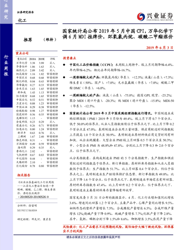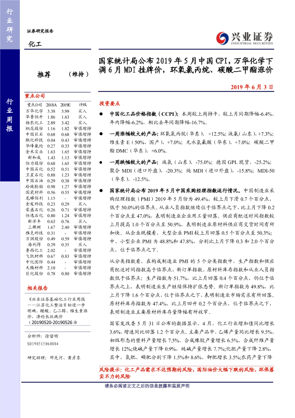 【兴业证券】【20190603】国家统计局公布2019年5月中国CPI,万华化学下调6月MDI挂牌价,环氧氯丙烷、碳酸二甲酯涨价-32页