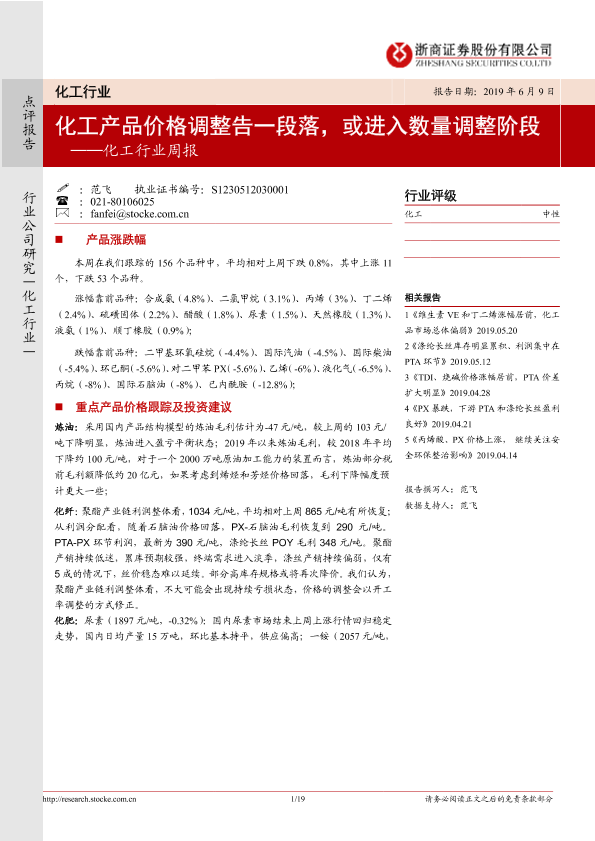 【浙商证券】【20190609】20190609-浙商证券-化工行业周报:化工产品价格调整告一段落,或进入数量调整阶段-19页