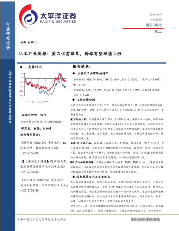 【太平洋证券】【20190609】化工行业周报:萤石供需偏紧,价格有望继续上涨-37页