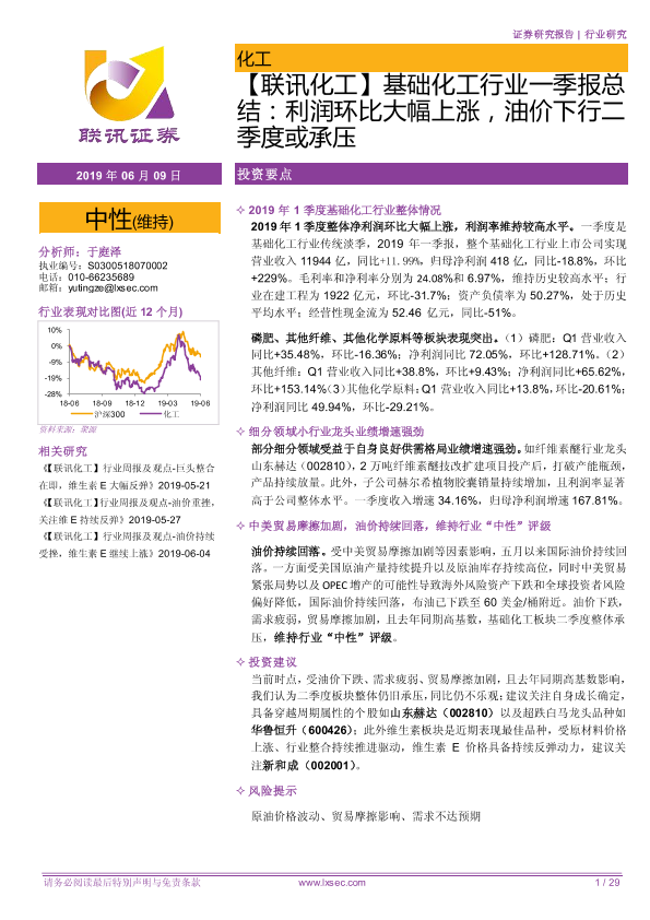 【粤开证券】【20190609】基础化工行业一季报总结:利润环比大幅上涨,油价下行二季度或承压-29页