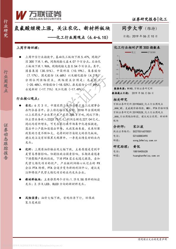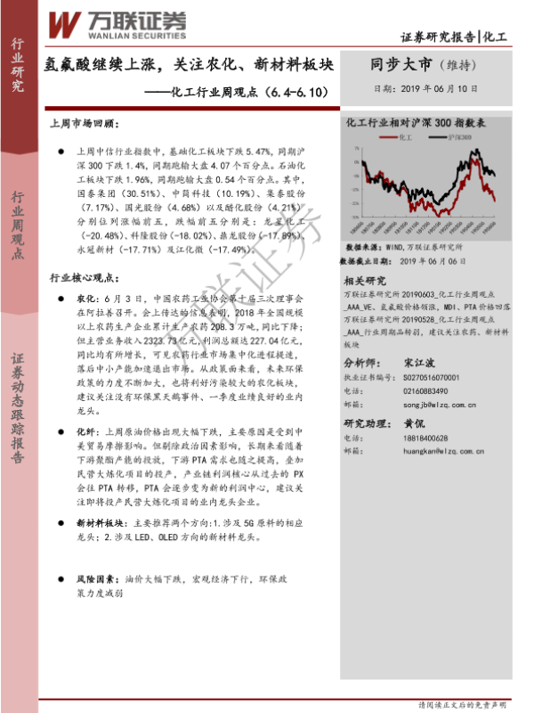【万联证券】【20190610】20190610-万联证券-化工行业周观点:氢氟酸继续上涨,关注农化、新材料板块-16页