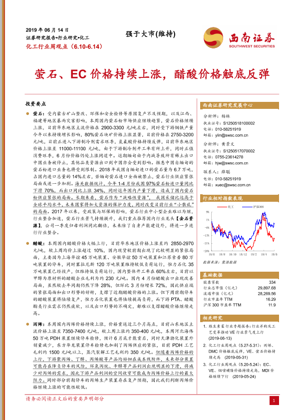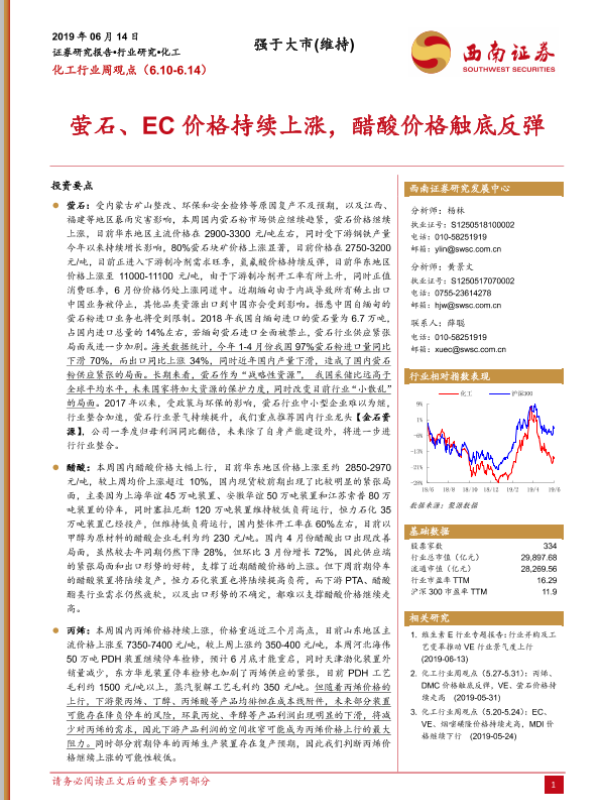 【西南证券】【20190614】20190614-西南证券-化工行业周观点:萤石、EC价格持续上涨,醋酸价格触底反弹-5页