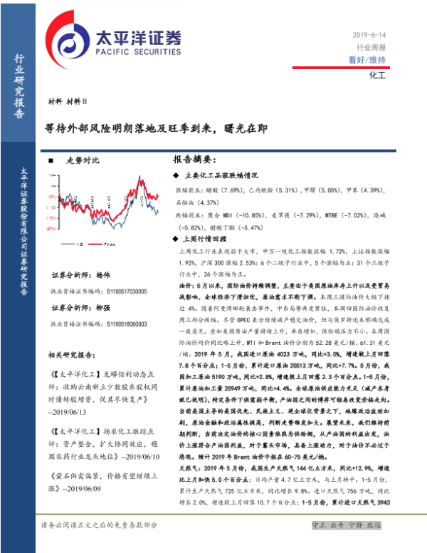 【太平洋证券】【20190614】20190614-太平洋-化工行业周报:等待外部风险明朗落地及旺季到来,曙光在即-38页
