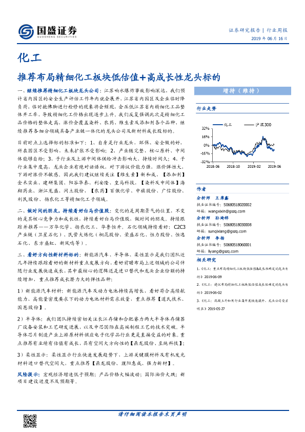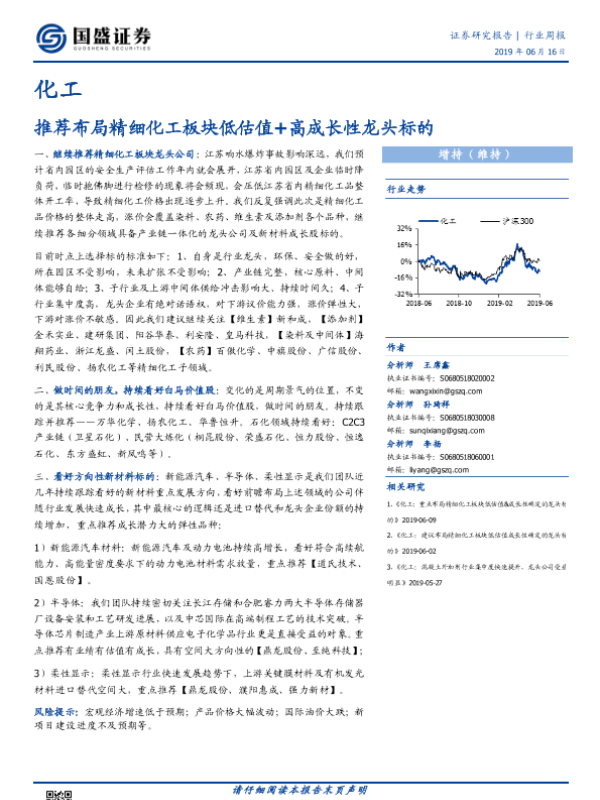 【国盛证券】【20190616】20190616-国盛证券-化工行业周报:推荐布局精细化工板块低估值+高成长性龙头标的-9页