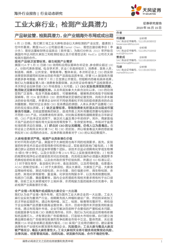 【天风证券】【20190615】工业大麻行业:检测产业具潜力-产品缺监管,检测具潜力,全产业链海外布局或成出路-6页