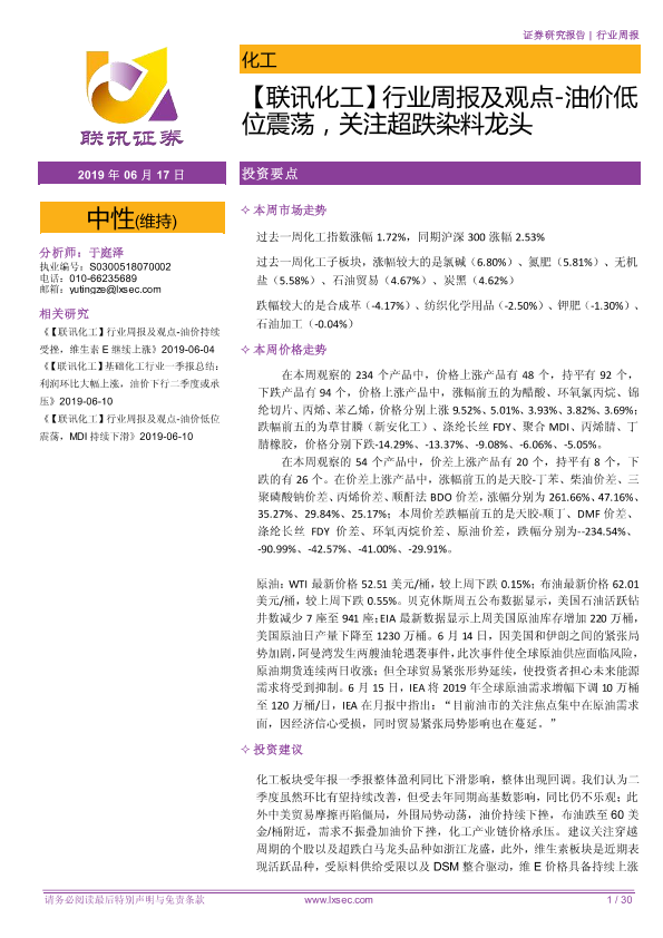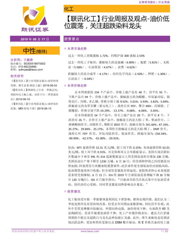 【粤开证券】【20190617】行业周报及观点-油价低位震荡,关注超跌染料龙头-30页