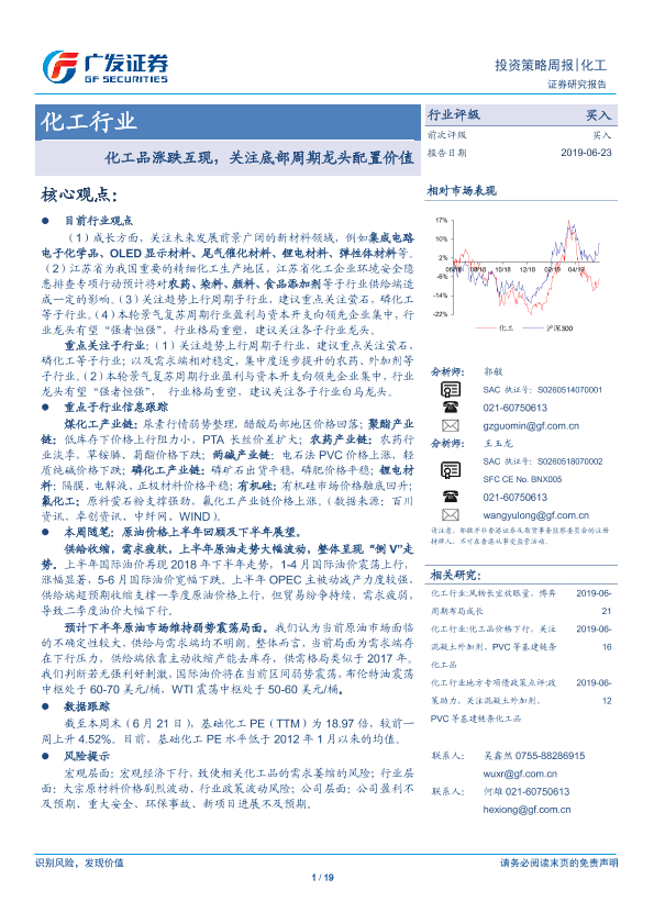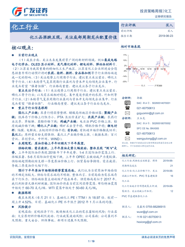 【广发证券】【20190623】20190623-广发证券-化工行业:化工品涨跌互现,关注底部周期龙头配置价值-19页