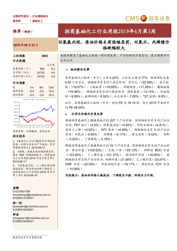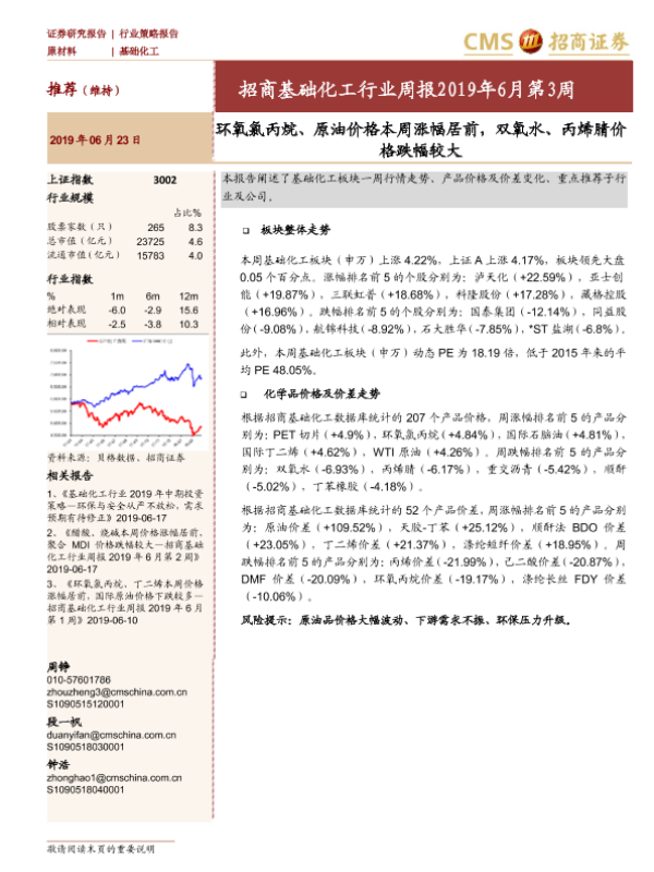 【海通证券】【20190623】基础化工行业周报2019年6月第3周:环氧氯丙烷、原油价格本周涨幅居前,双氧水、丙烯腈价格跌幅较大-18页