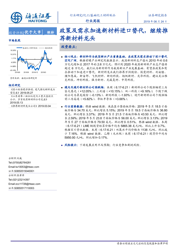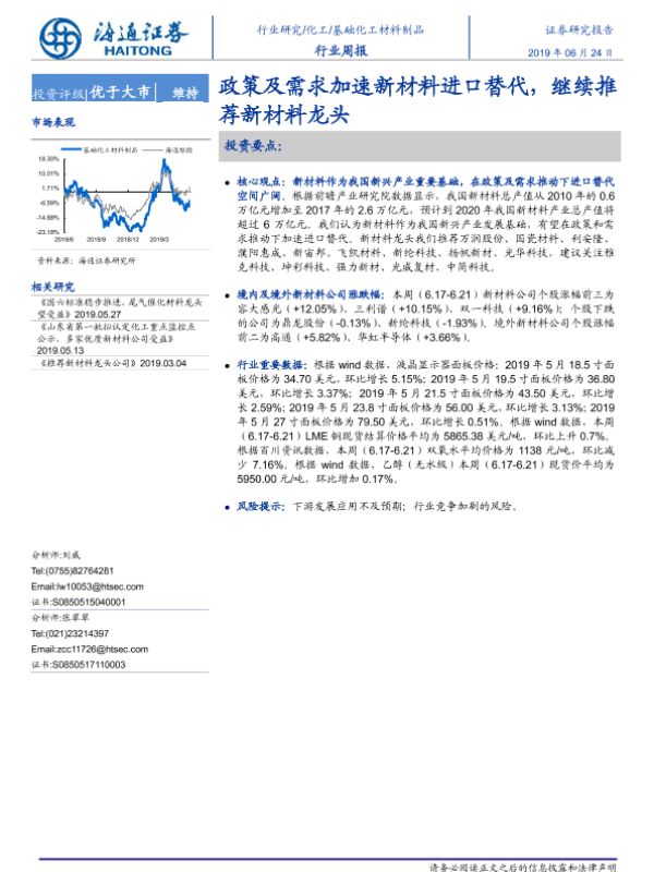 【海通证券】【20190624】基础化工材料制品行业周报:政策及需求加速新材料进口替代,继续推荐新材料龙头-9页