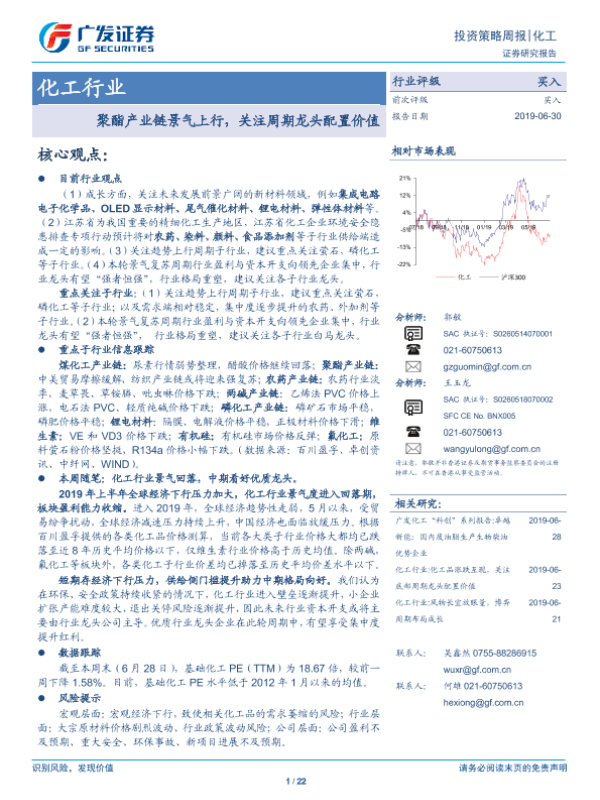 【广发证券】【20190630】化工行业:聚酯产业链景气上行,关注周期龙头配置价值-22页