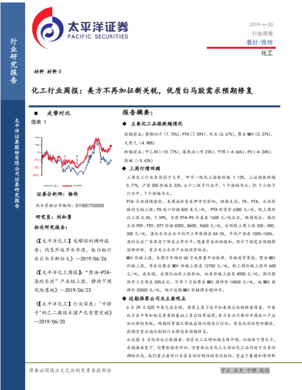 【太平洋证券】【20190630】化工行业周报:美方不再加征新关税,优质白马股需求预期修复-37页