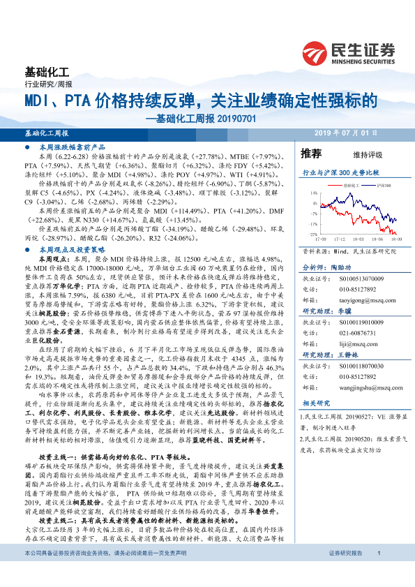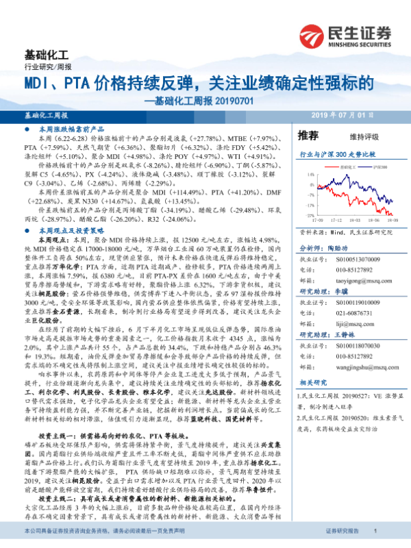 【民生证券】【20190701】20190701-民生证券-基础化工周报:MDI、PTA价格持续反弹,关注业绩确定性强标的-30页