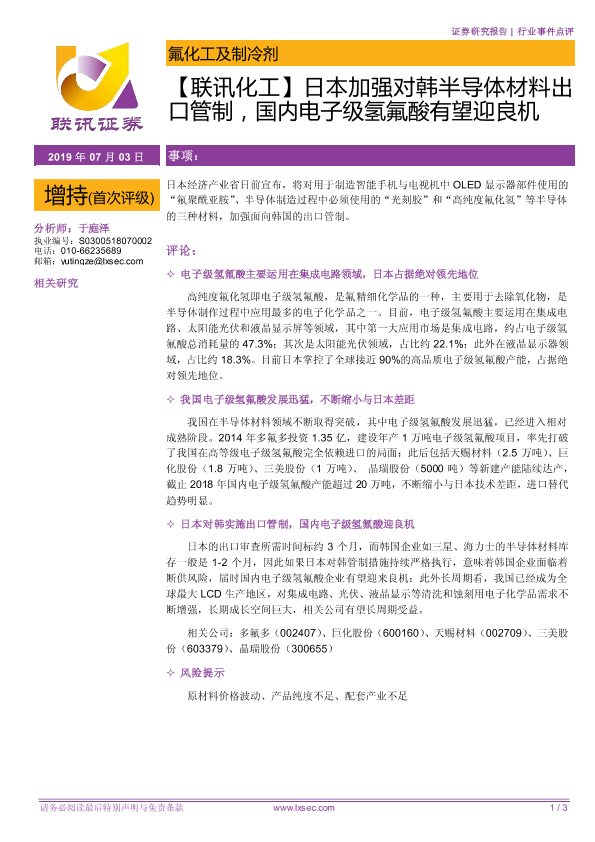 【粤开证券】【20190703】日本加强对韩半导体材料出口管制,国内电子级氢氟酸有望迎良机-3页