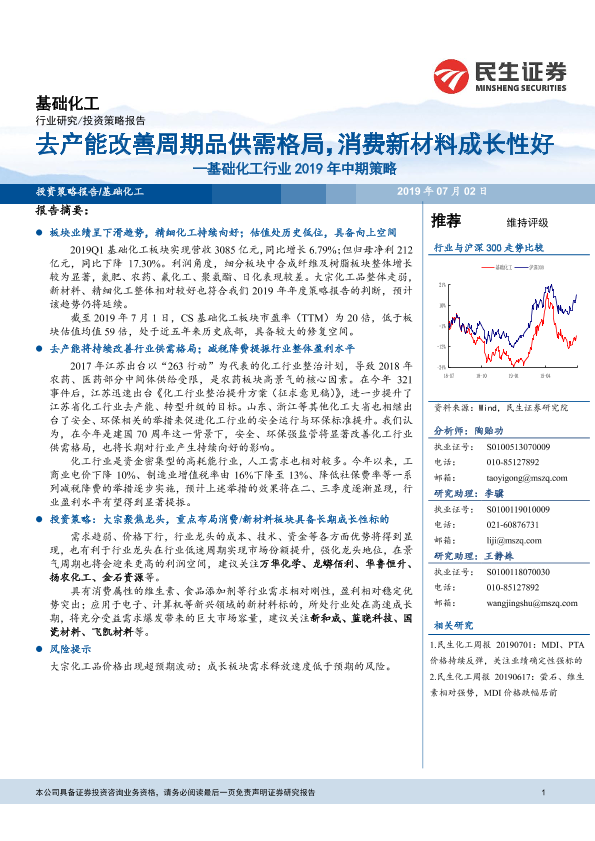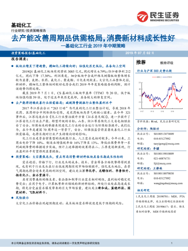 【民生证券】【20190702】基础化工行业2019年中期策略:去产能改善周期品供需格局,消费新材料成长性好-41页