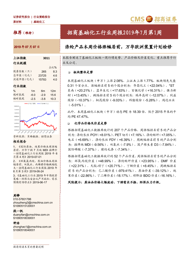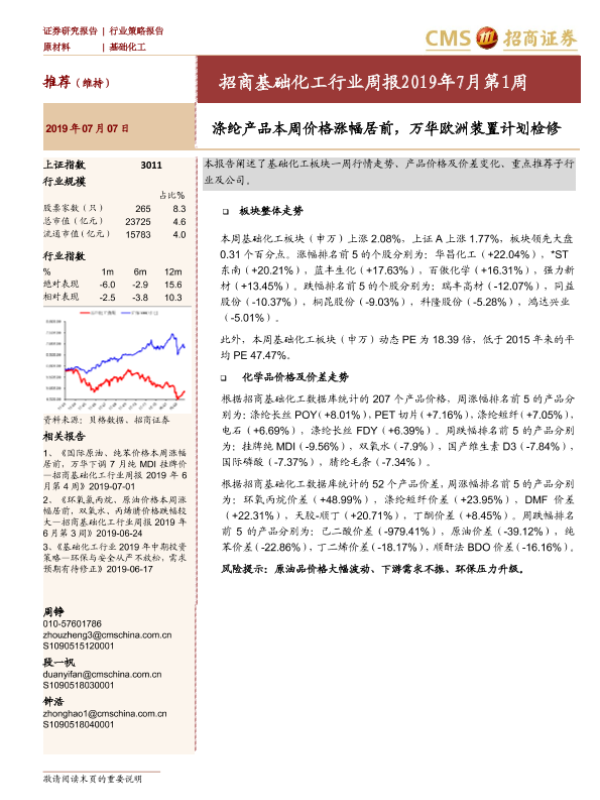 【海通证券】【20190707】招商基础化工行业周报2019年7月第1周:涤纶产品本周价格涨幅居前,万华欧洲装置计划检修-17页